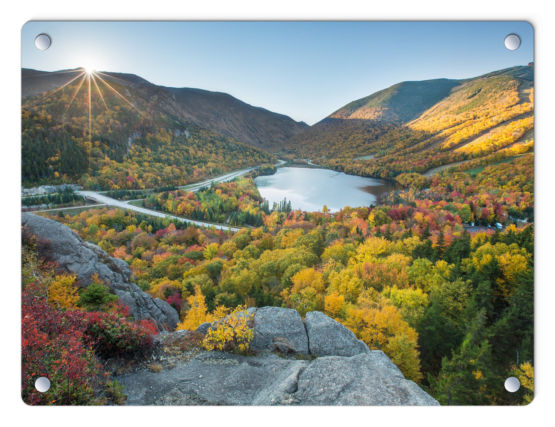 The sun rises up over Mount Lafayette, painting the brilliant fall foliage over Echo Lake and Cannon Mountain. Franconia Notch State Park, White Mountains, New Hampshire.