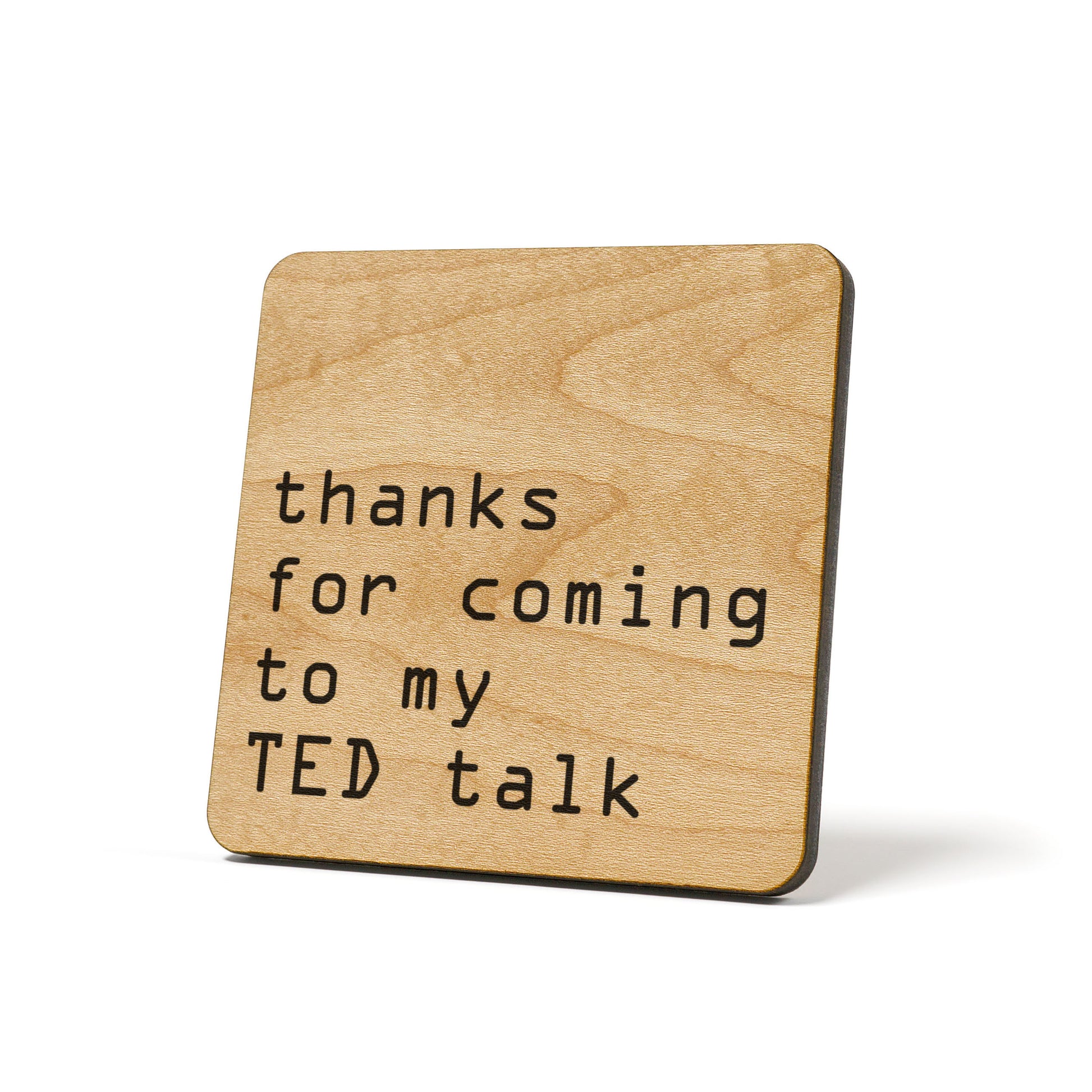 Wood has a satin finish with a magnet backing which can be used as a coaster or a magnet. Dimensions: 3.5" x 3.5"