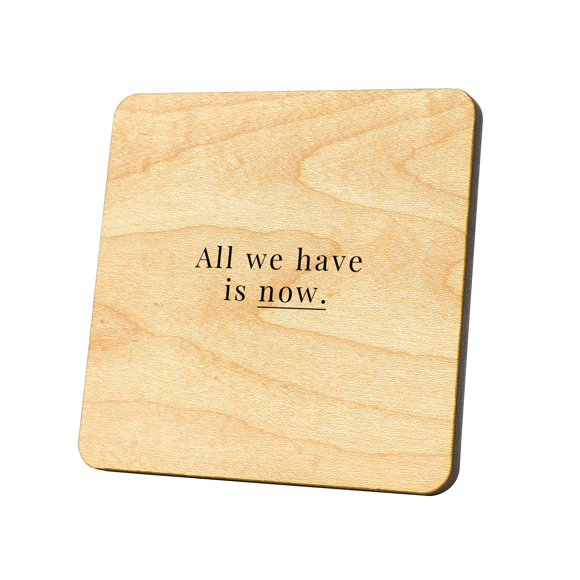 Wood has a satin finish with a magnet backing which can be used as a coaster or a magnet. Dimensions: 3.5" x 3.5"