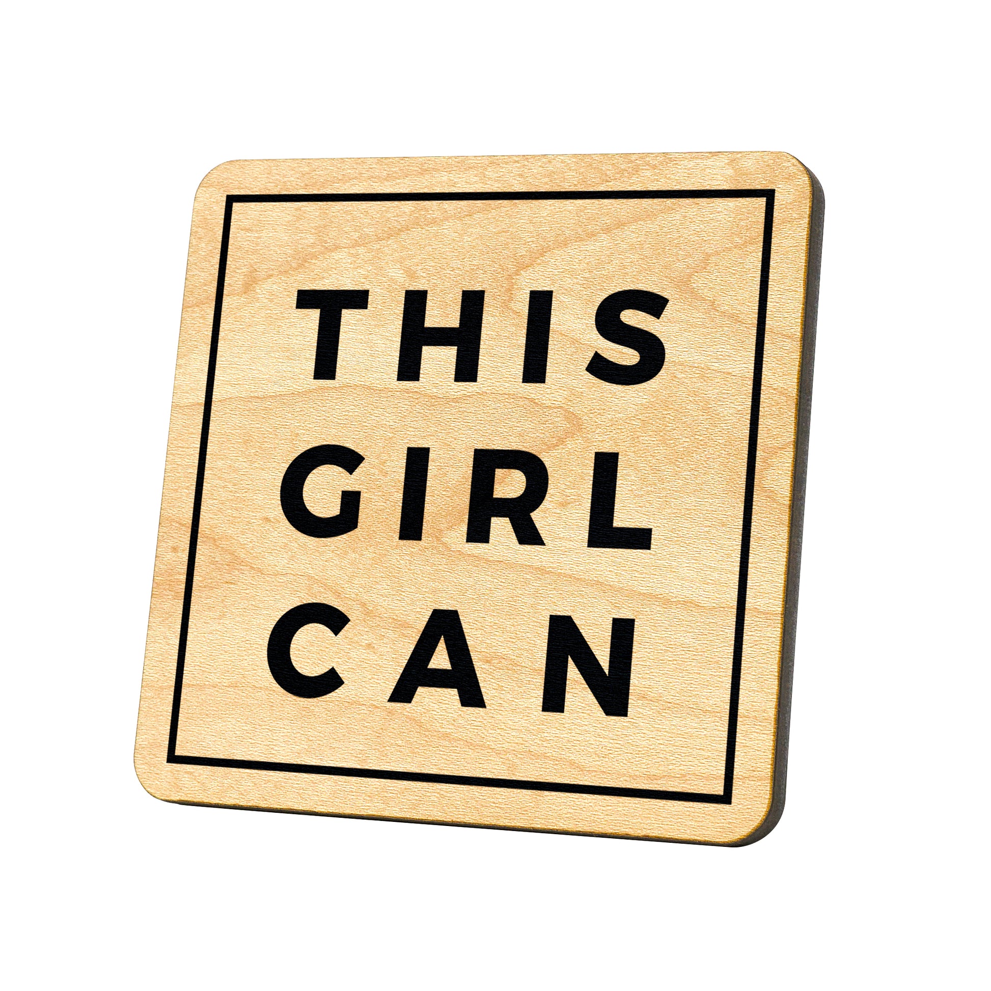 Wood has a satin finish with a magnet backing which can be used as a coaster or a magnet. Dimensions: 3.5" x 3.5"