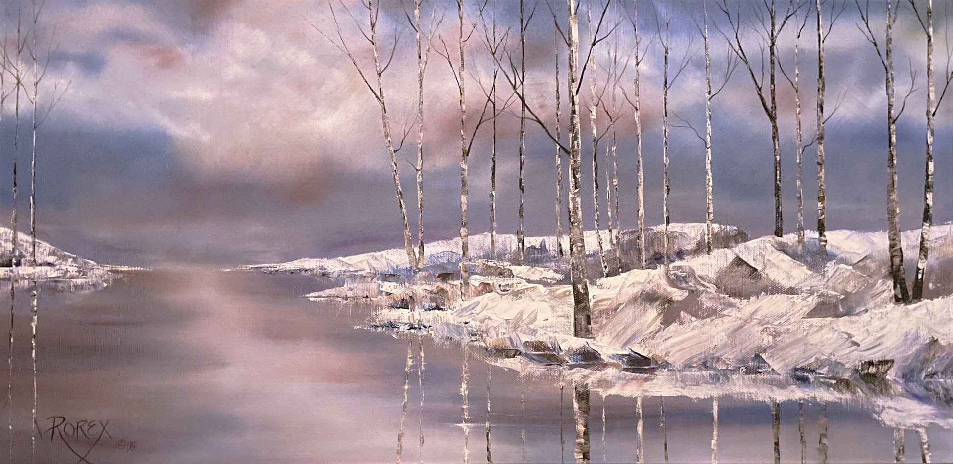 The bare birch trees, growing in snow covered rocky ground, and the colors from the winter sky are reflected in the calm waters of Fall River. SOLD OUT