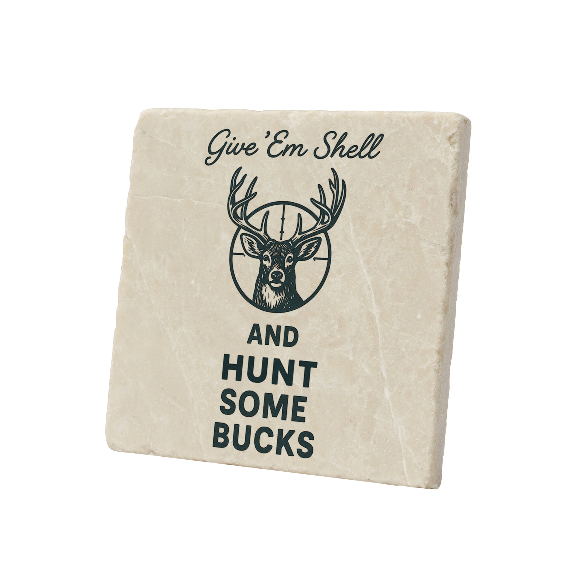 Aim true and embrace the outdoors with the Give ’Em Shell and Hunt Some Bucks Graphic Coaster.
