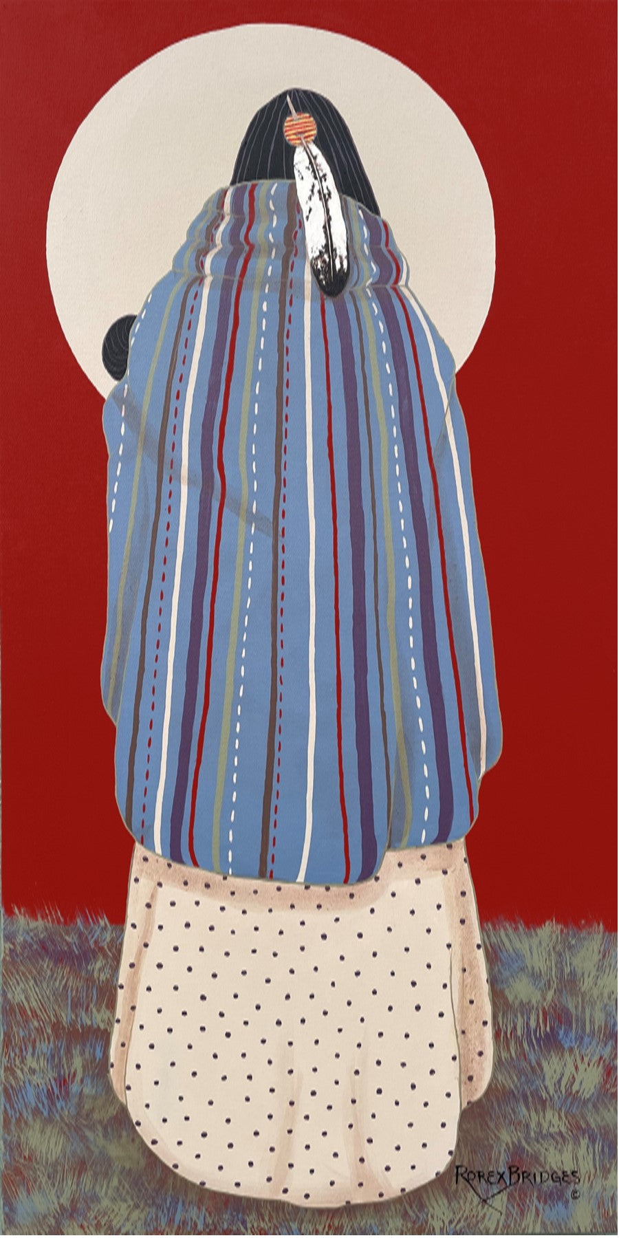 The young mother has been gifted her Grandfather's Eagle Feather...which she cherishes and believes it protects her and her child. She will gift the Feather to her child when they are older and begin their own family.