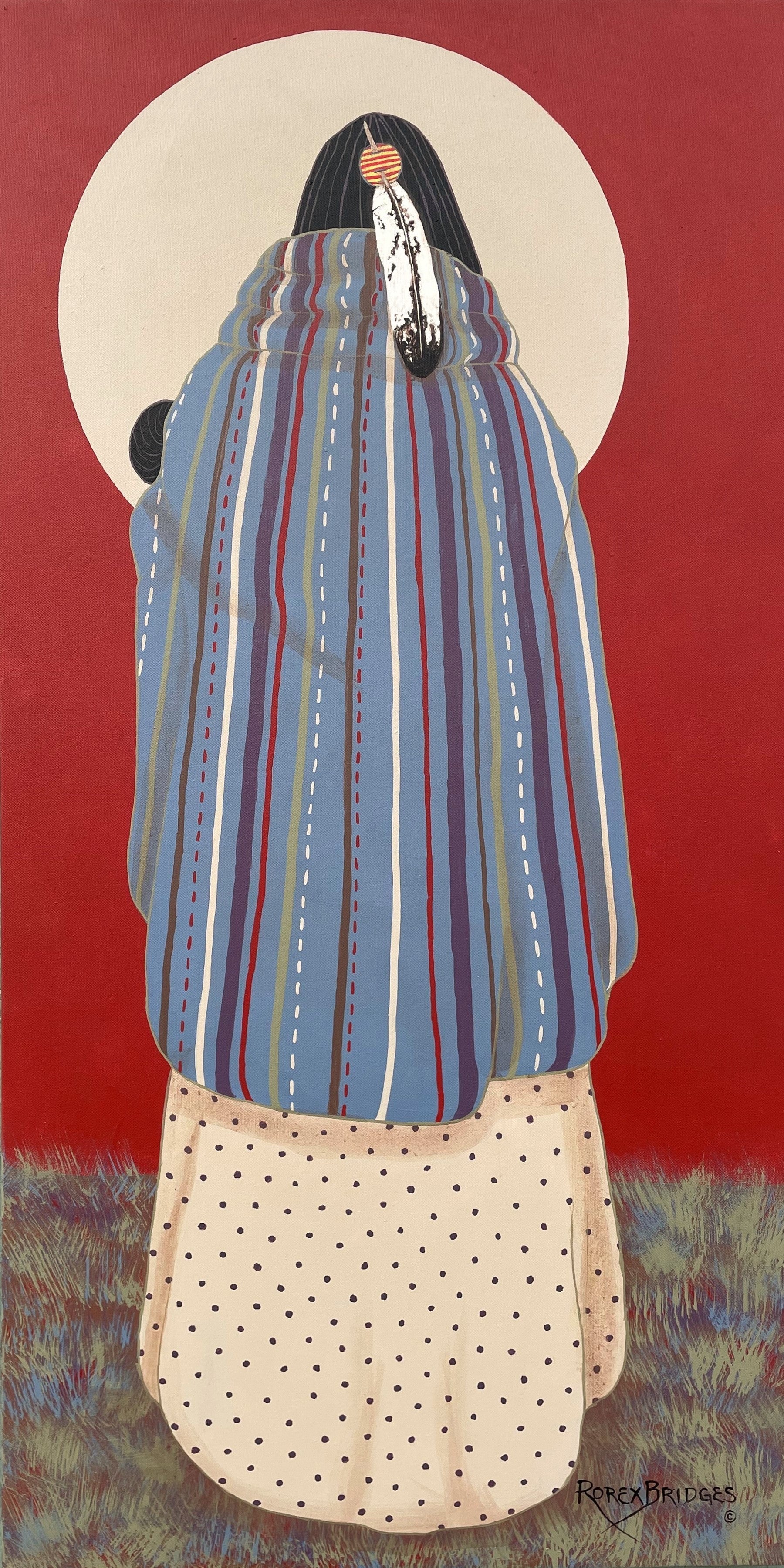 The young mother has been gifted her Grandfather's Eagle Feather—which she cherishes and believes protects her and her child. She will gift the Feather to her child when they are older and begin their own family.