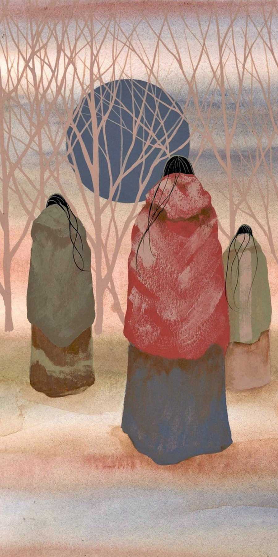 The natural soft colors of the ground and the sky and the stronger, yet muted colors of the women's blanket shawls, create a very comfortable painting to add to your home.
