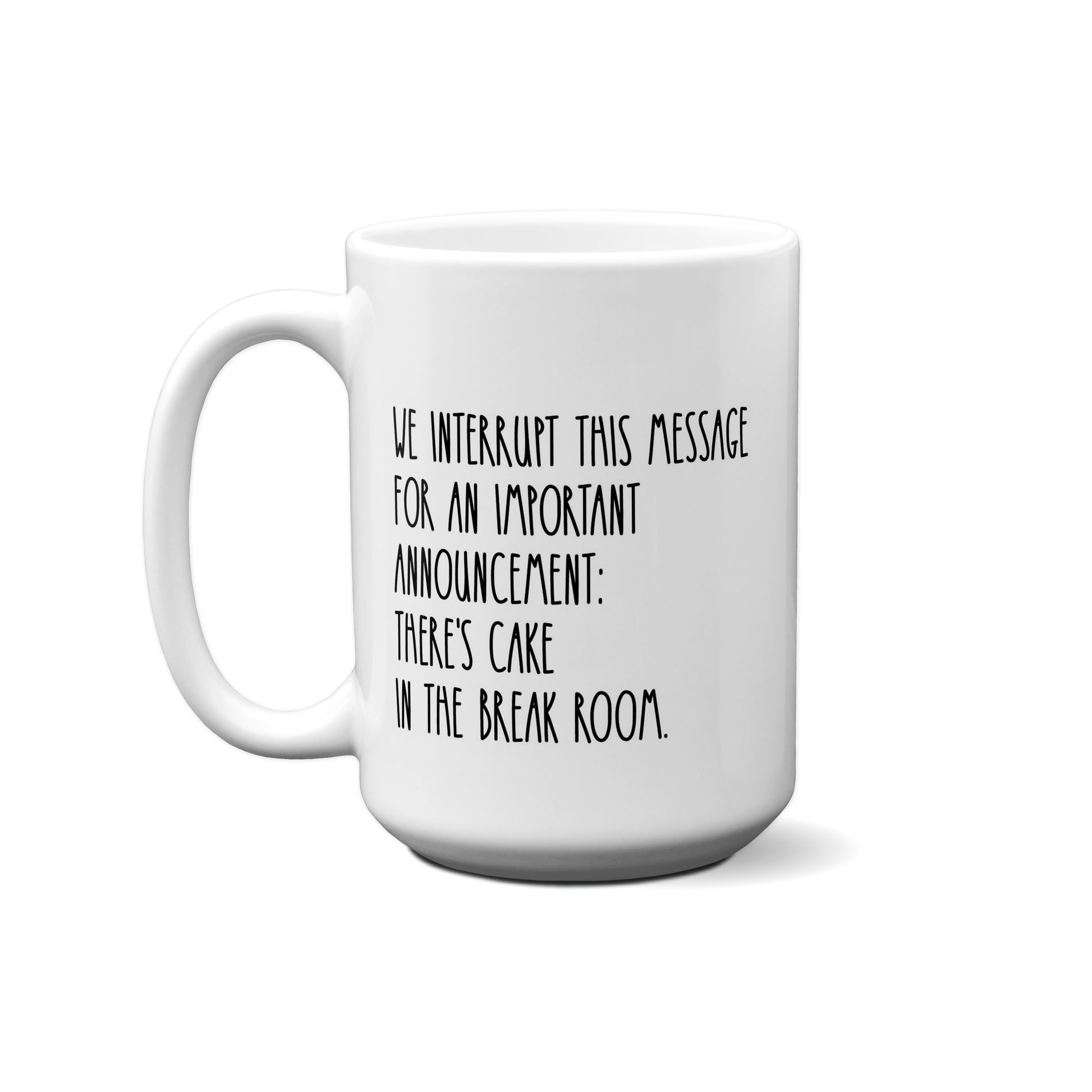 We Interrupt This Message For An Important Announcement: There's Cake In The Break Room. Quote mug.